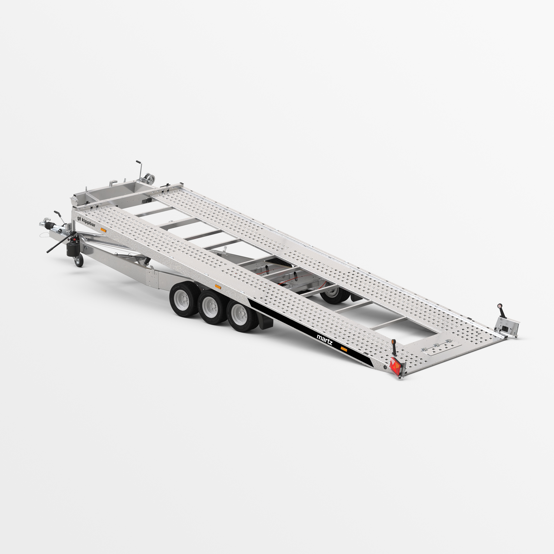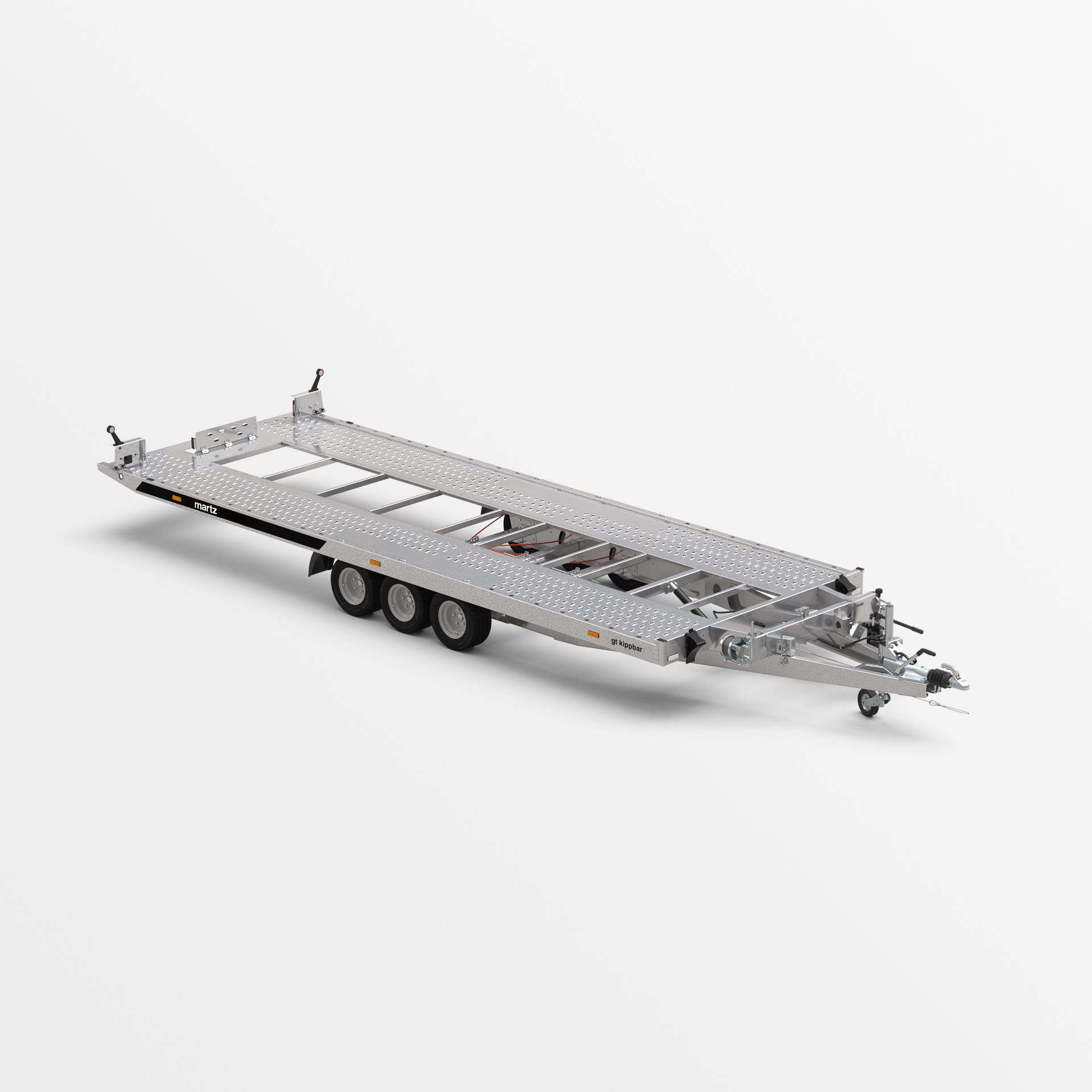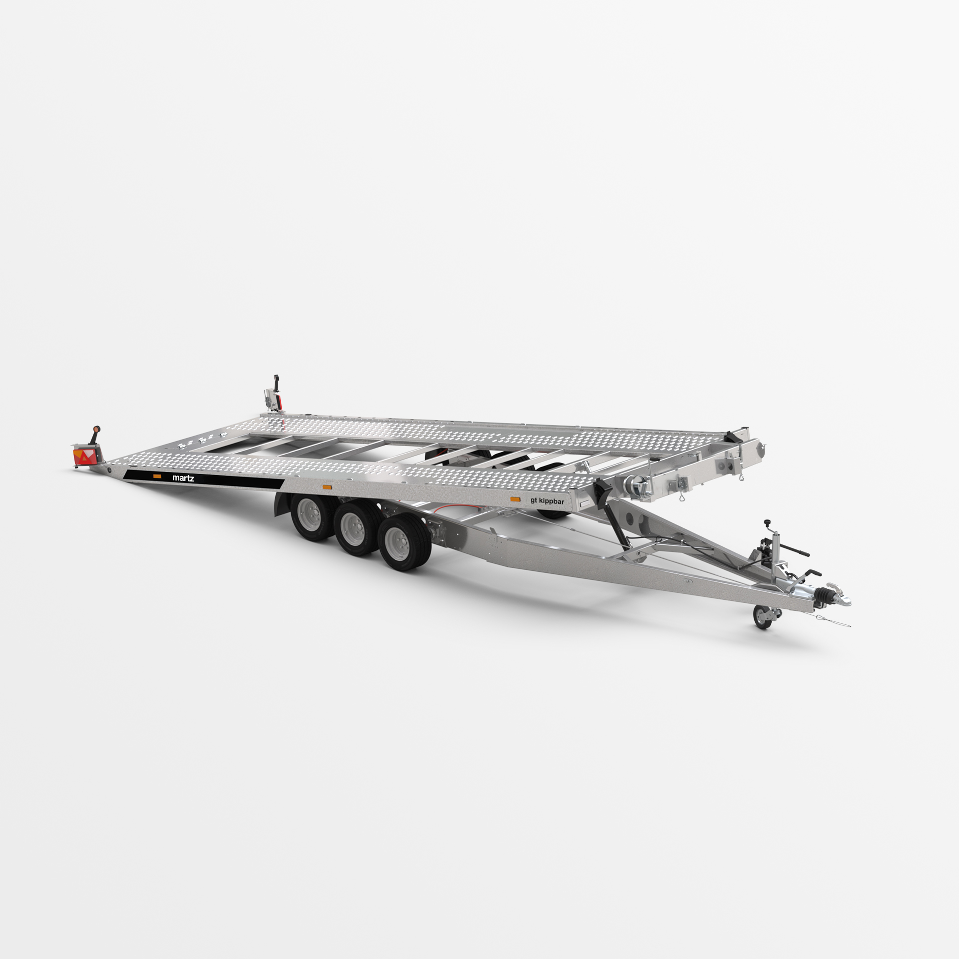 Pkw-Anhänger mit einer Kippfunktion für die Transportfläche. Der verwendete Hydraulikzylinder sorgt für eine reibungslose und einfache Bedienung beim Beladen. Der niedrige Abfahrtswinkel von 11° erleichtert das Beladen von Fahrzeugen mit geringer Bodenfreiheit. Der hochbelastbare Hohlprofilrahmen sorgt zusammen mit dem verstärkten Fahrwerk und der Deichsel für Sicherheit und Langlebigkeit. Die Seitenträger mit Öffnungen und der Boden aus Lohrer Blech ermöglichen dank ihrer dicht angeordneten Öffnungen eine einfache Sicherung der zu transportierenden Fahrzeuge. Zahlreiche Ausstattungsvarianten wie Alu-Wellblech auf Sperrholz, Alu-Wellblech oder Alu-Paneele ermöglichen es, den Anhänger an die individuellen Bedürfnisse anzupassen. Optional kann der Anhänger mit einer vollständigen LED-Beleuchtung ausgestattet werden. Er ist die ideale Lösung für Unternehmen, die auf der Suche nach einer zuverlässigen Autotransportausrüstung sind.