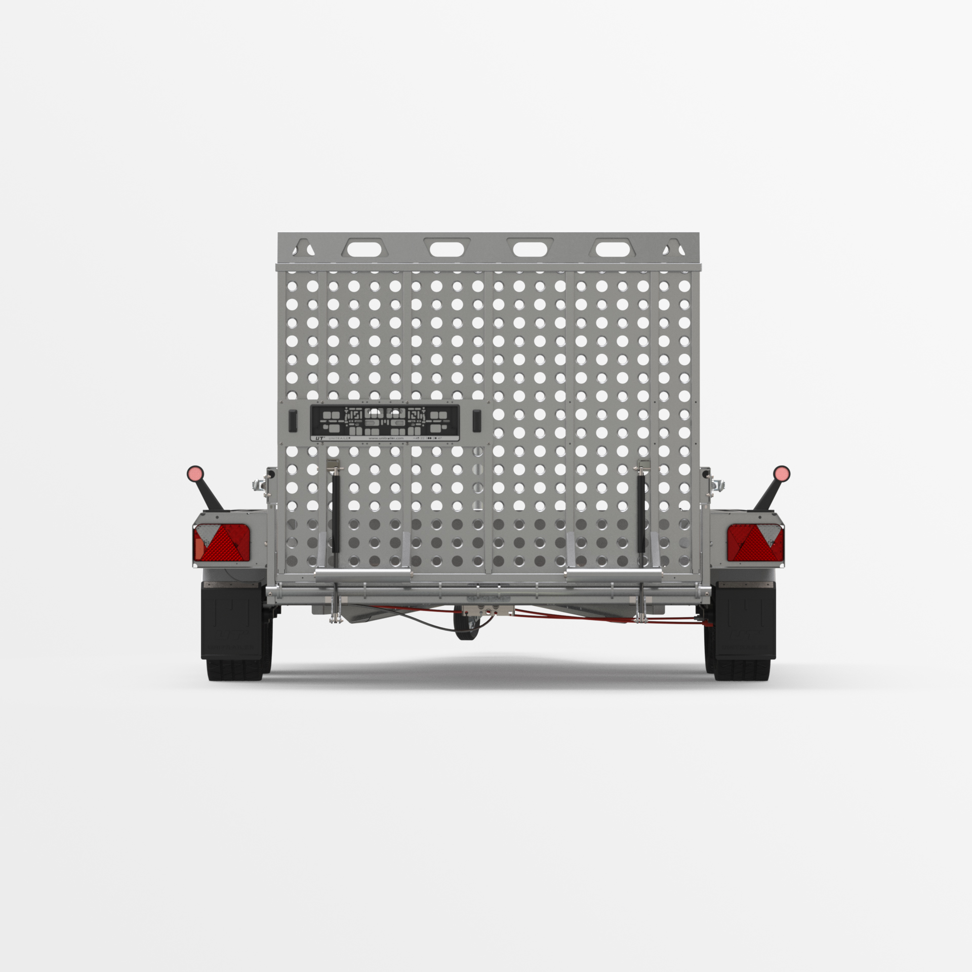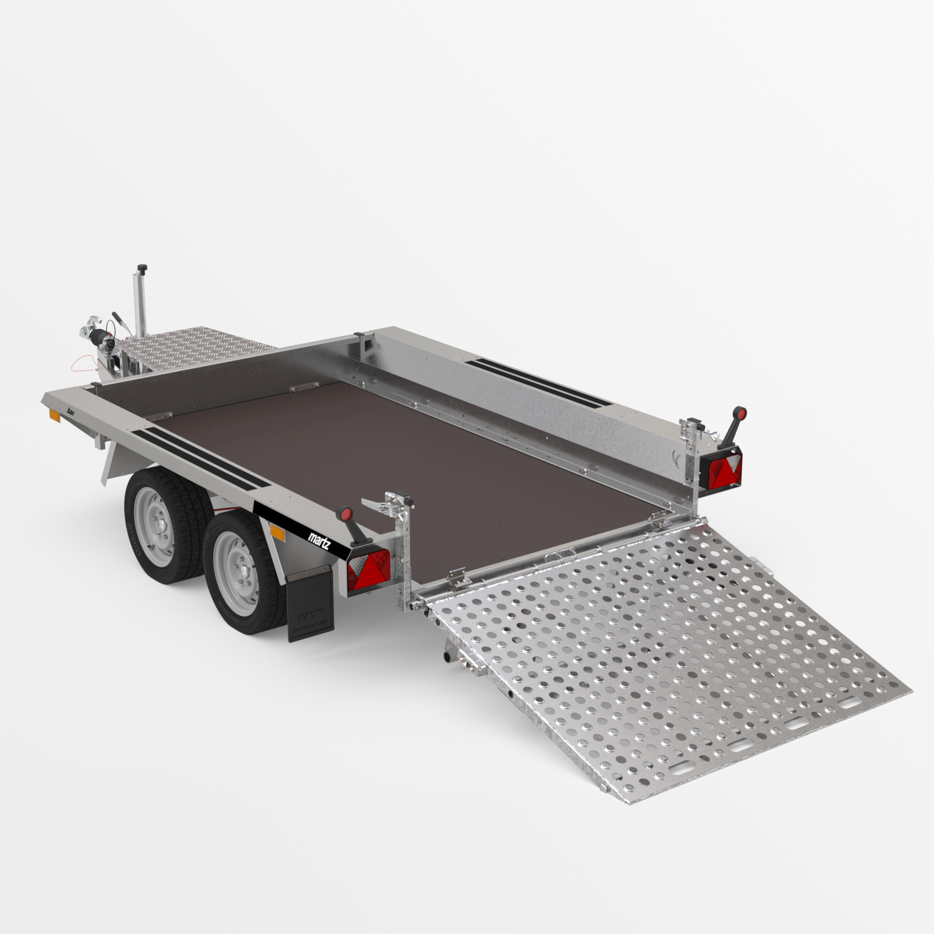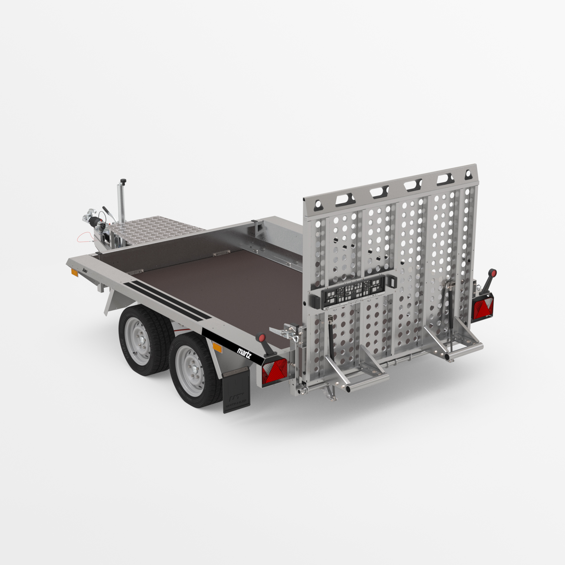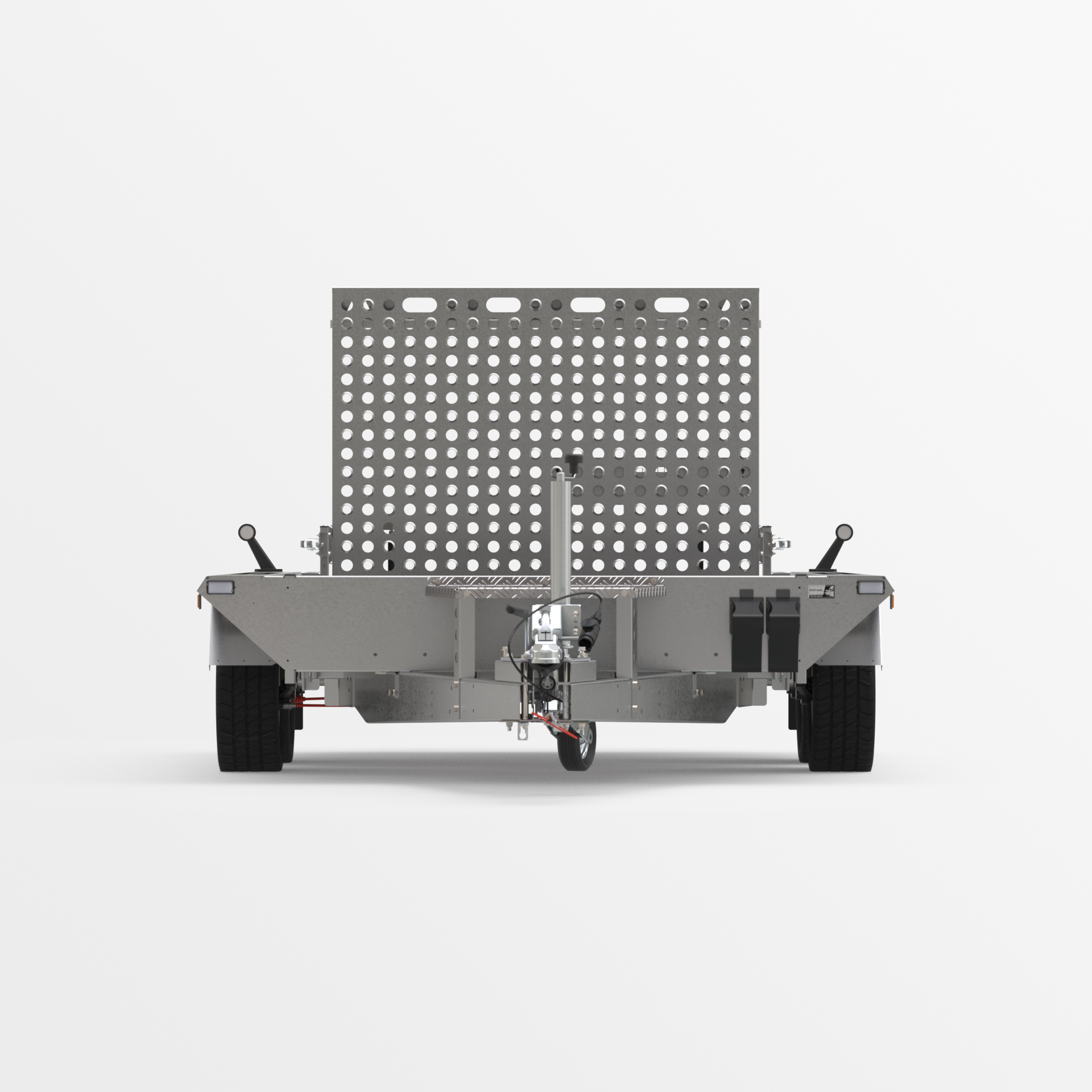 Robust welded trailer for transporting construction machinery and very heavy materials. The original design gives the possibility of walking on the entire length of the sides equipped with anti-slip strips. Welded load-bearing frame made of closed steel profiles. Floor made of waterproof anti-slip plywood equipped with solild floor brackets for cargo fastening to ensure the safety of transported goods. Extra sturdy V-type drawbar and supports to stabilize the overrun. Bucket support and support wheel with automatic folding as standard. Springs for easy lowering and raising of the overrun. Possibility of replacing the wide overrun ramp with two overruns reducing the weight of the trailer and thus increasing its payload capacity.