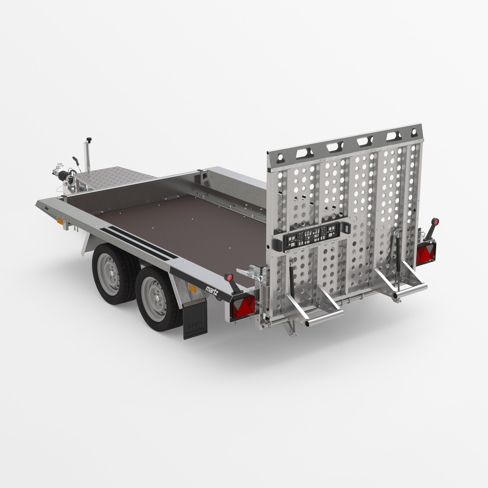 Robust welded trailer for transporting construction machinery and very heavy materials. The original design gives