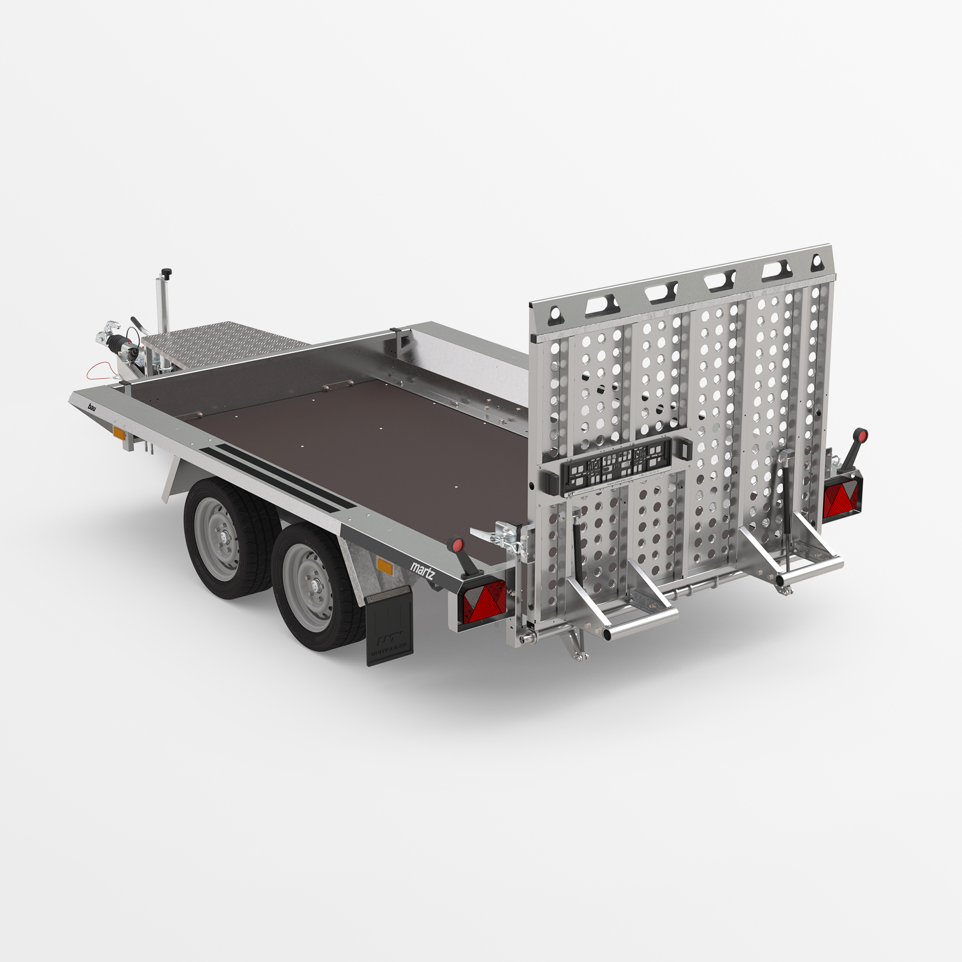 Robust welded trailer for transporting construction machinery and very heavy materials. The original design gives