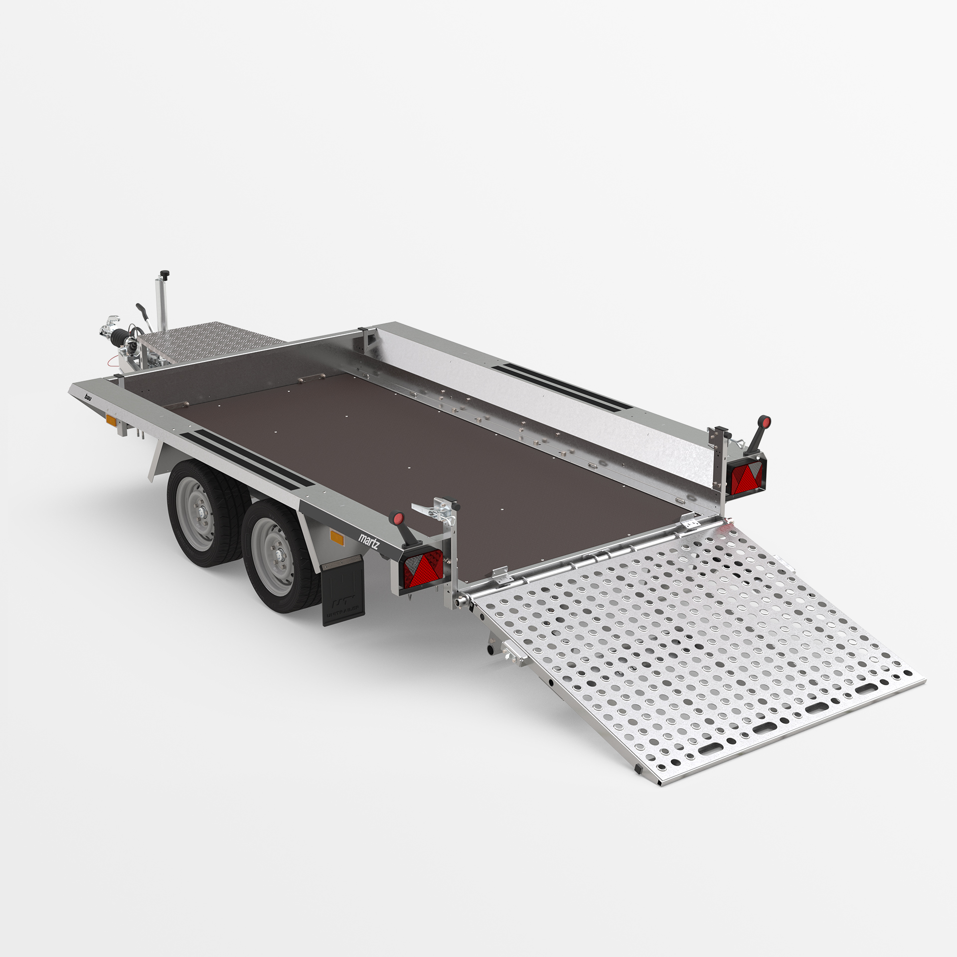 and support wheel with automatic folding as standard. Springs for easy lowering and raising of the overrun. Possibility of replacing the wide overrun ramp with