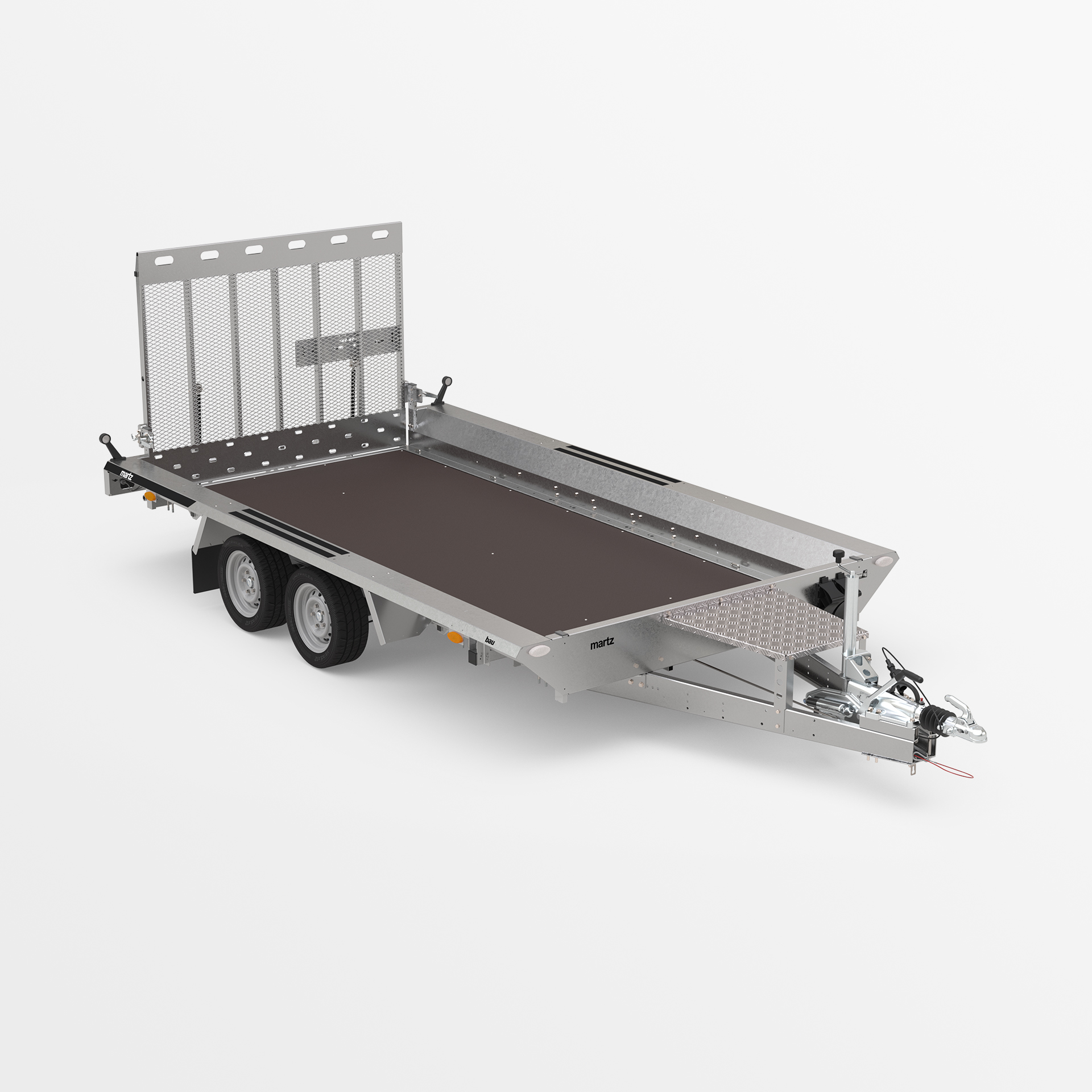 Robust welded trailer for transporting construction machinery and very heavy materials. The original design gives