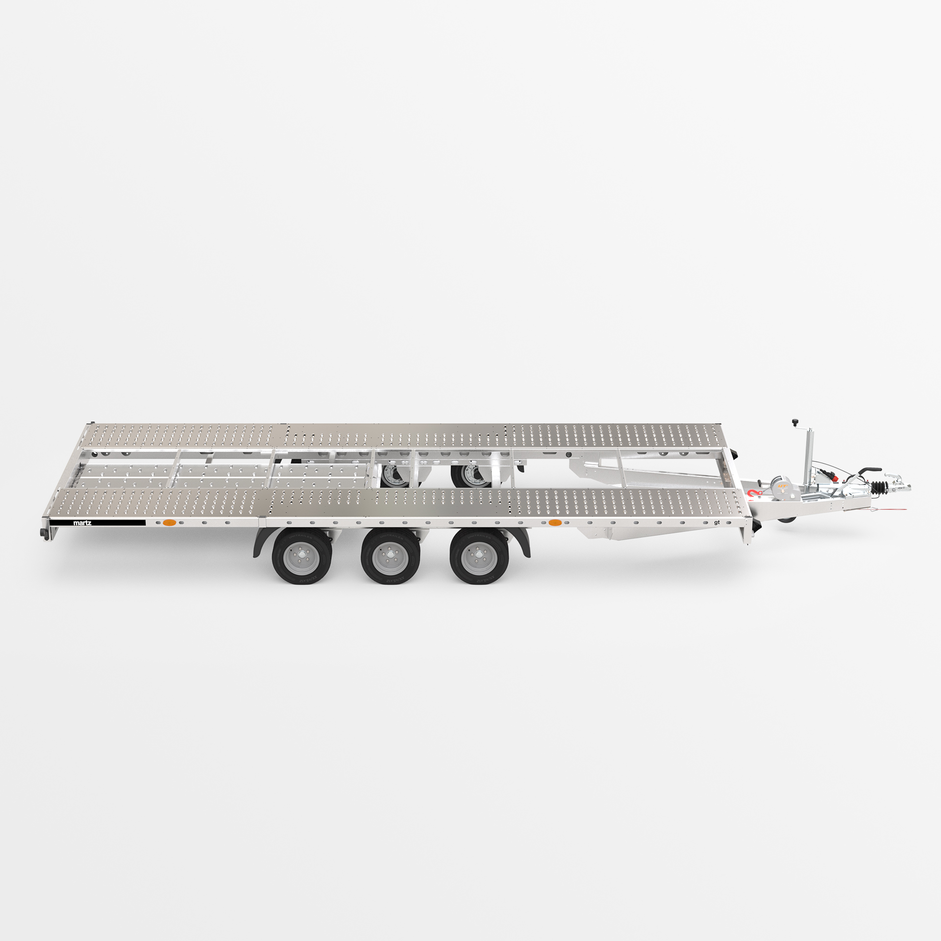 Trailer for vehicle transport with a solid welded construction. Equipped with an automatic jockey wheel, numerous tie-down points, a winch for easier loading, steel ramps, and wheel chocks.