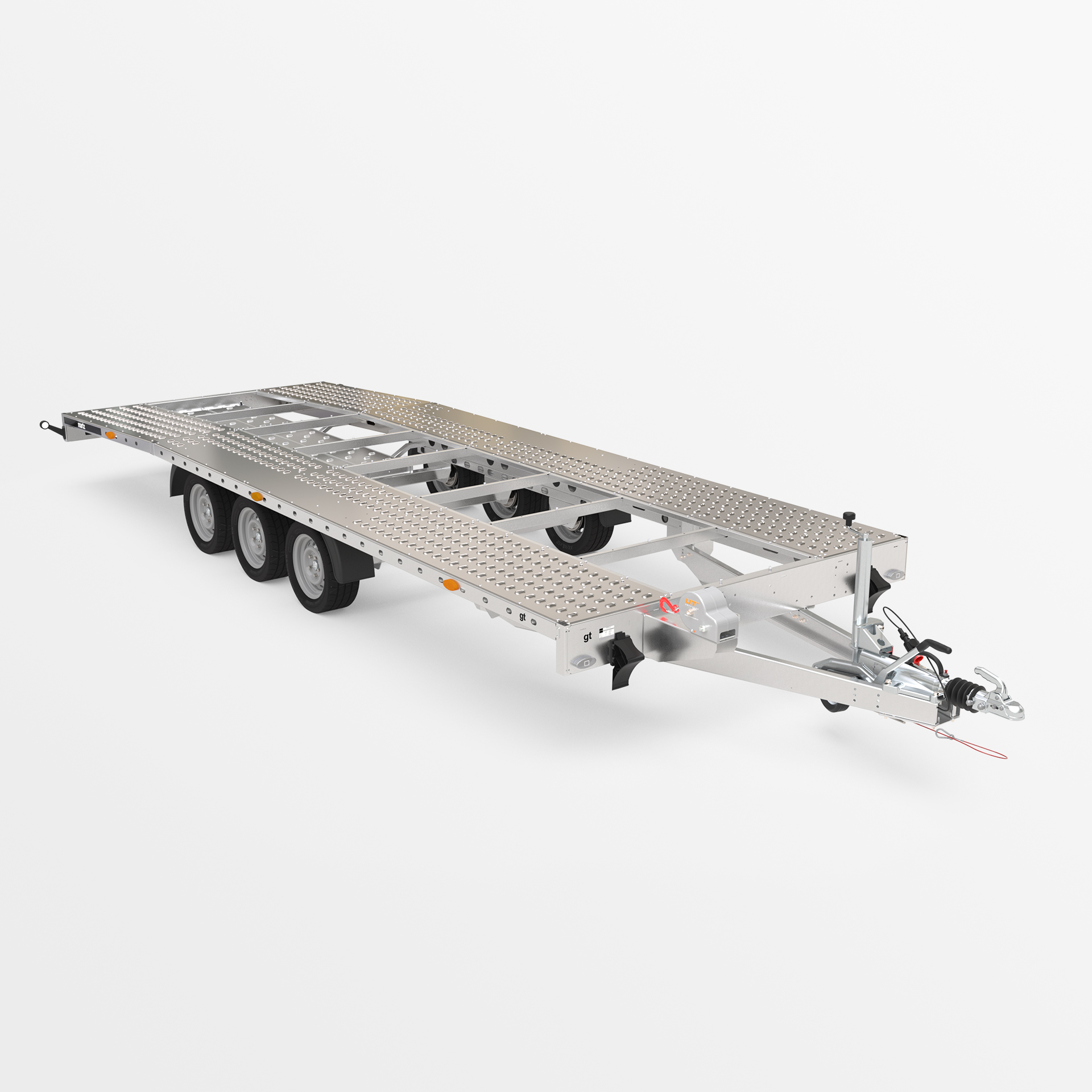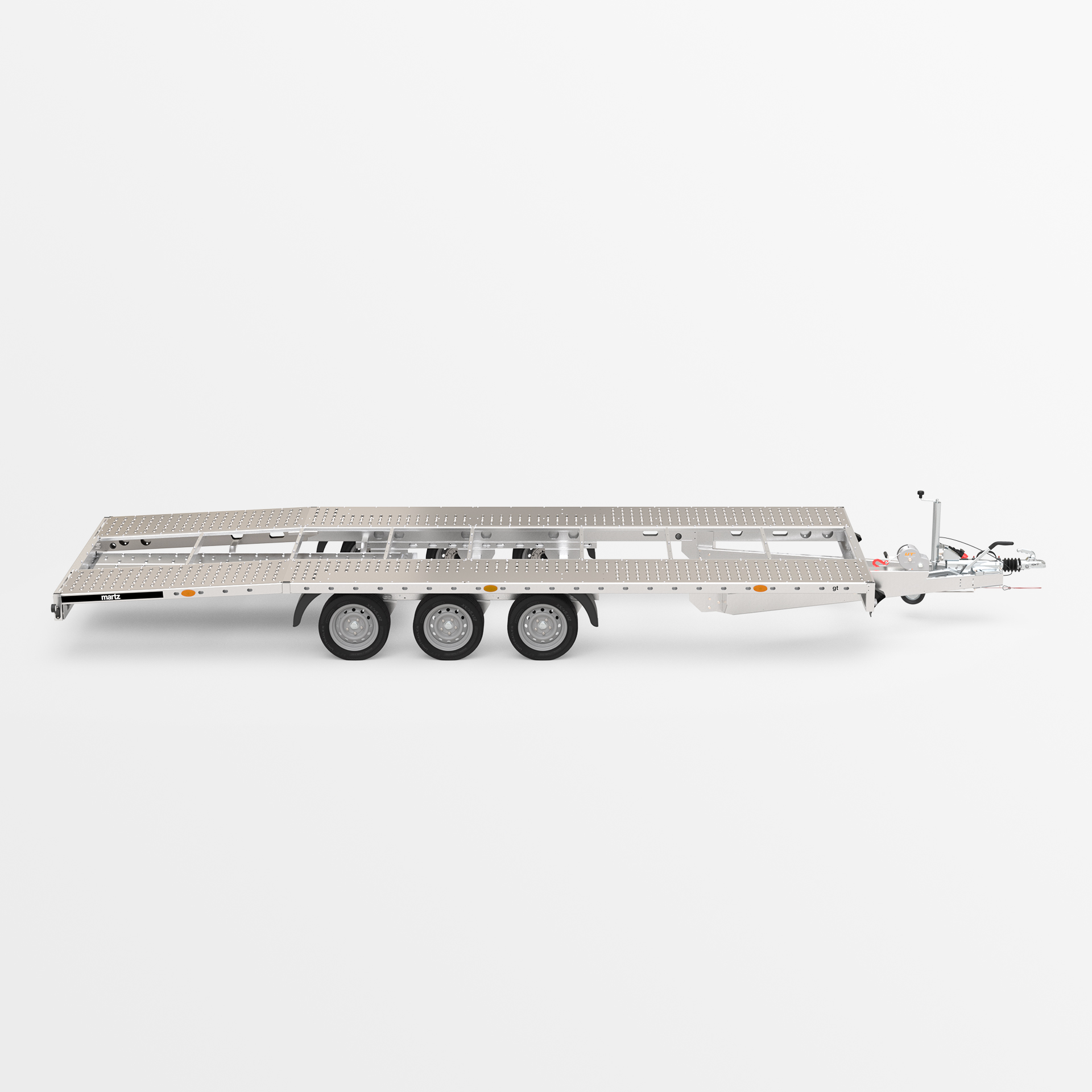 Trailer for vehicle transport with a solid welded construction. Equipped with an automatic jockey wheel, numerous tie-down points, a winch for easier loading, steel ramps, and wheel chocks.