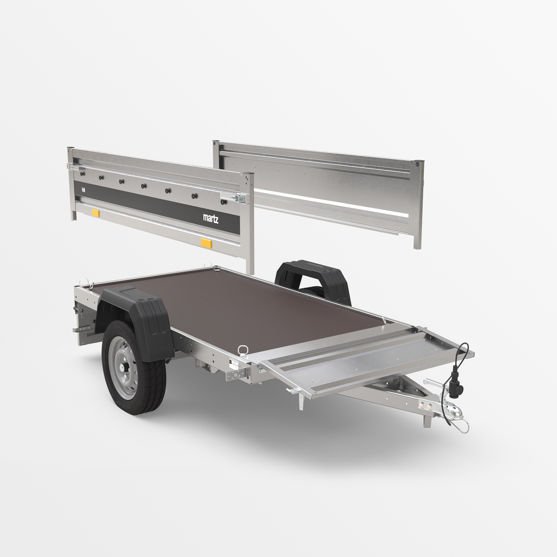 Remorque de transport conçue pour assurer un transport sécurisé de diverses charges. Grâce a des ridelles de 40 cm de hauteur et aux ridelles avant et arriere basculantes, le chargement et le déchargement sont rapides et pratiques. La structure soudée garantit une grande durabilité, tandis que le timon basculant améliore le confort d'utilisation. Les butées sur le châssis arriere assurent une position stable de la remorque sur sa ridelle arriere, ce qui lui permet d’occuper peu d’espace lors du stockage.