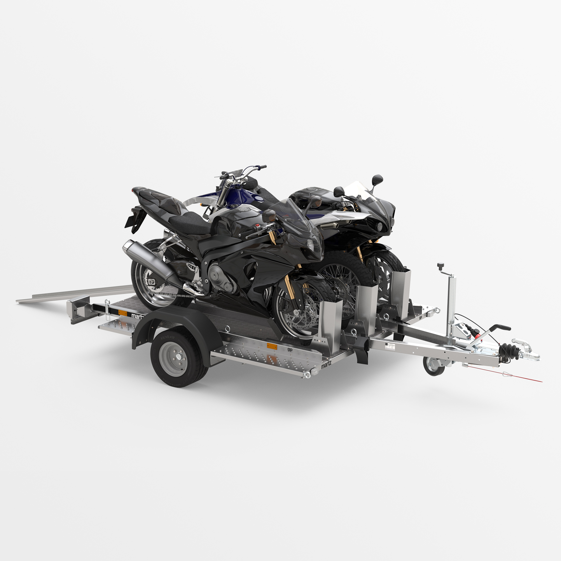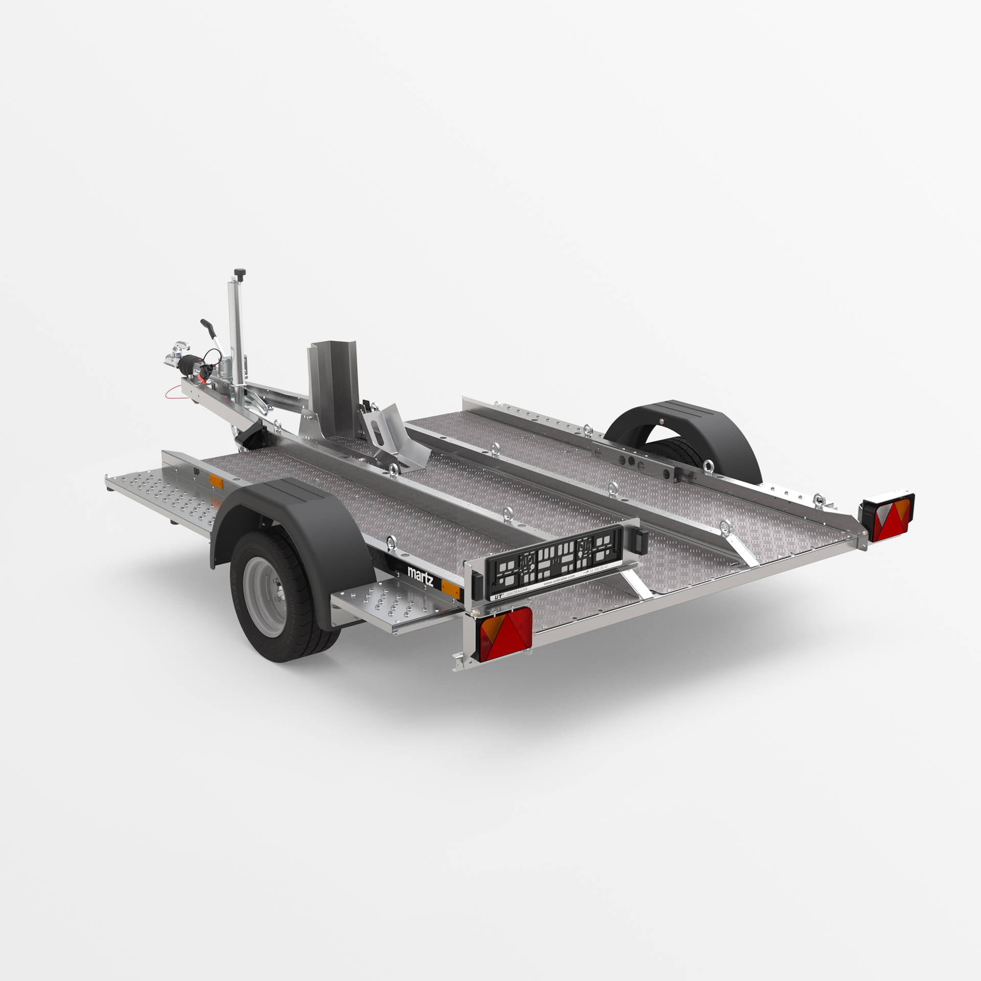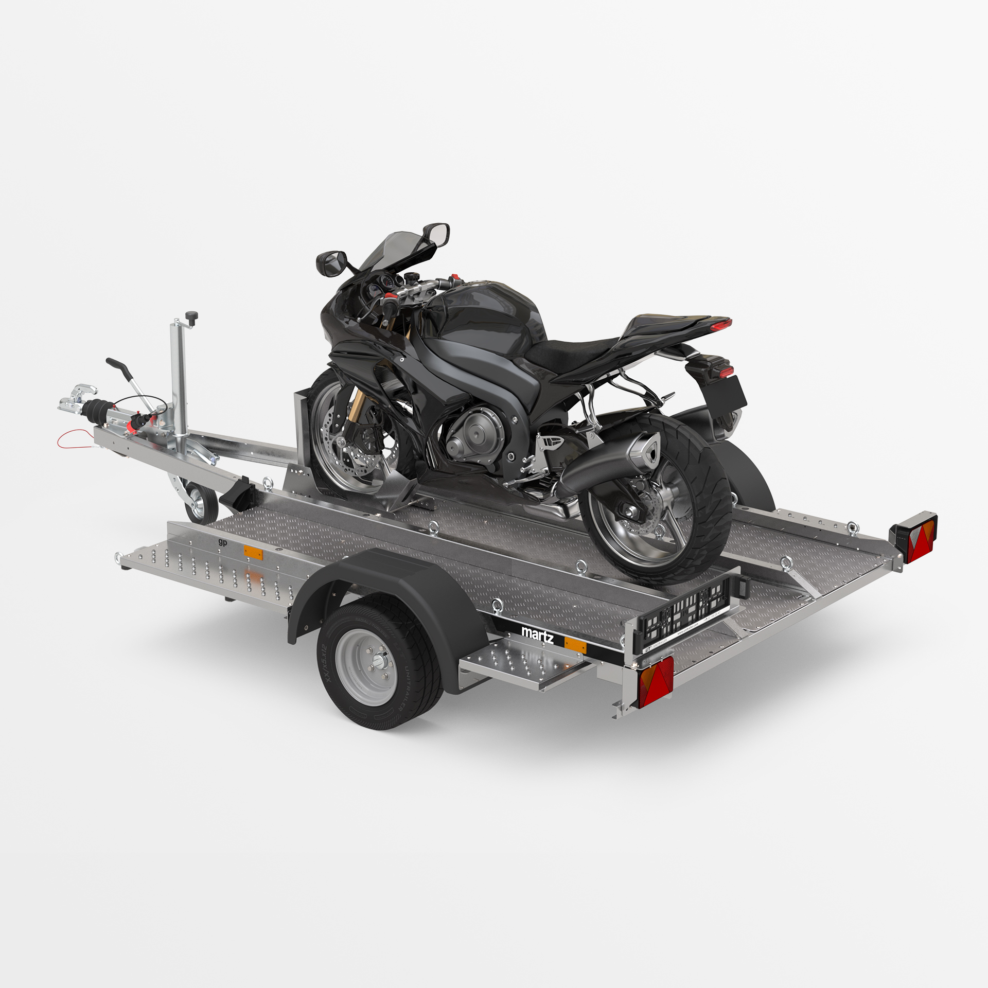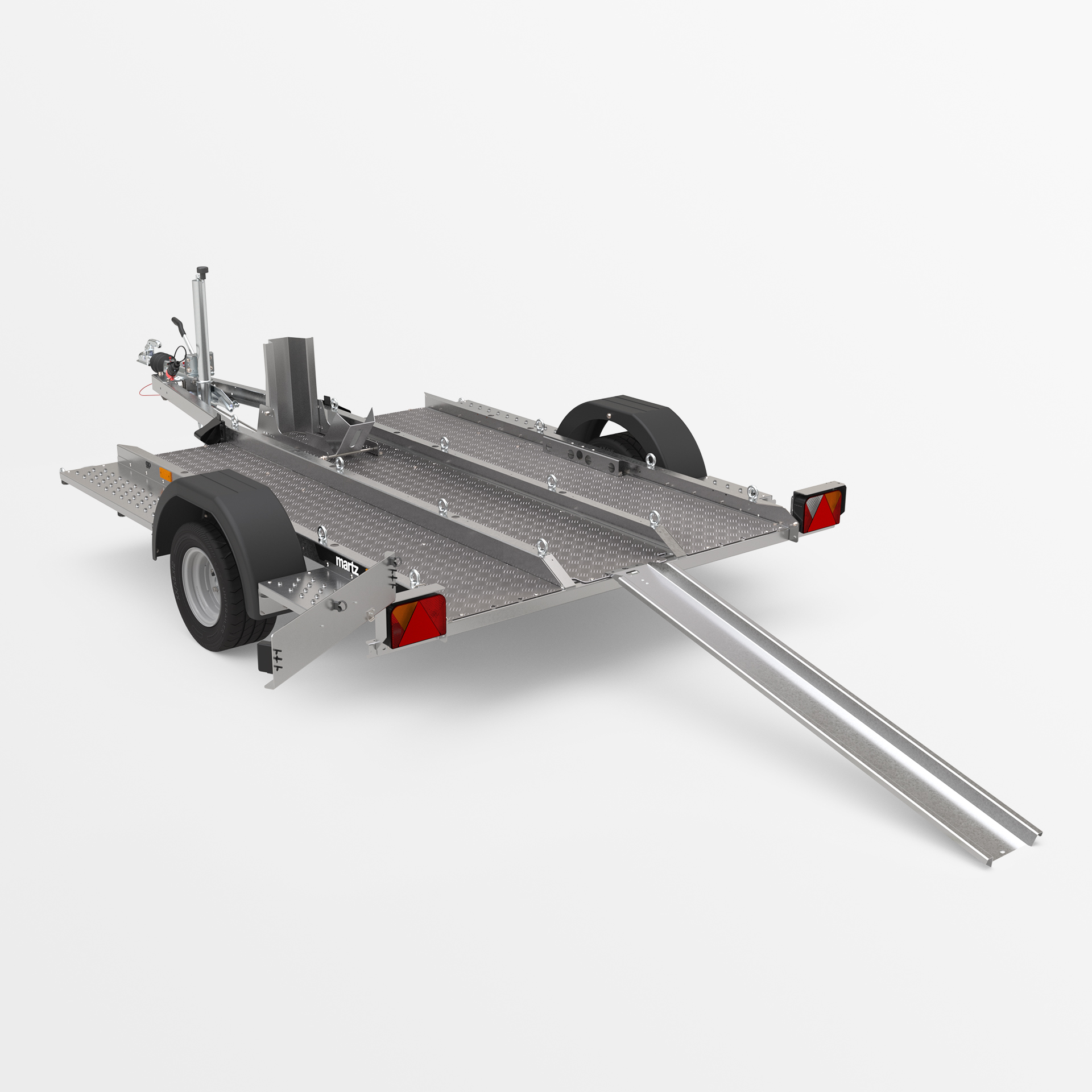 Przyczepa o spawanej konstrukcji, dedykowana do transportu motocykli i innych jednośladów. Platforma załadunkowa wykonana z ryflowanej blachy aluminiowej została wyposażona w liczne punkty mocowania pasów transportowych, zapewniające stabilne zabezpieczenie pojazdu. Obniżona konstrukcja z niskim progiem załadunku umożliwia łatwy i bezpieczny wjazd motocyklem.