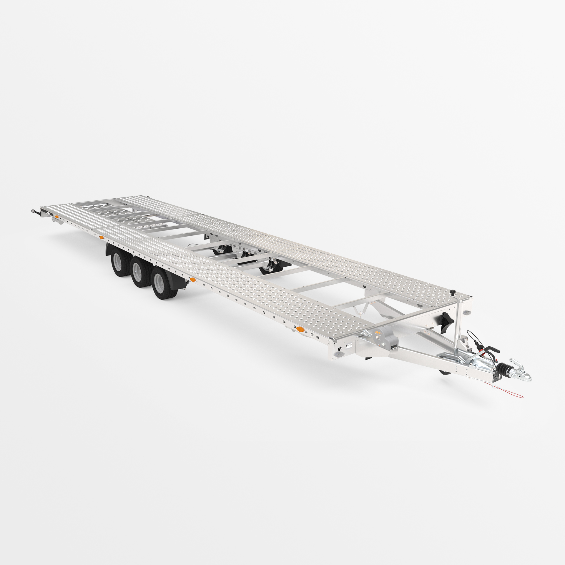 Laweta samochodowa z konstrukcji spawanej, wyposażona w rynnę przejazdową, stalowe najazdy chowane pod powierzchnią transportową oraz wspornik wciągarki z możliwością montażu po lewej lub prawej stronie.
